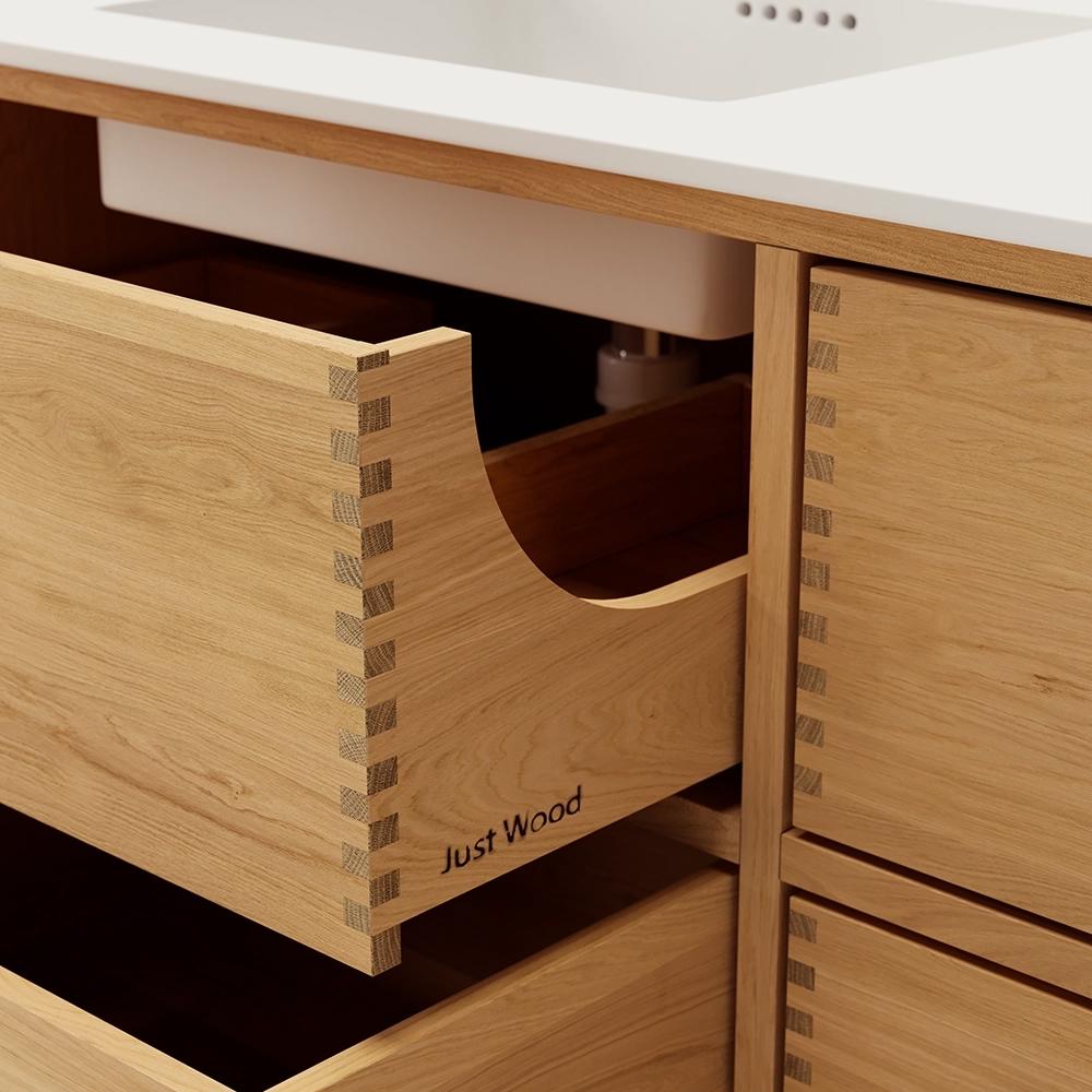 Et unikt snekkerprodukt laget av de beste materialene. Solide, oljete og fingertappende treskuffer i eik. Alle skuffer med fullt uttrekk og soft close. Sterk 8 mm. tykk understell og ekstra dype skuffer som utnytter plassen i skapet optimalt. Alt er laget for å passe perfekt sammen.