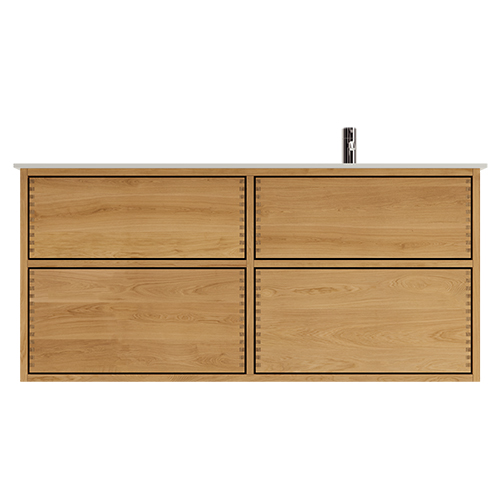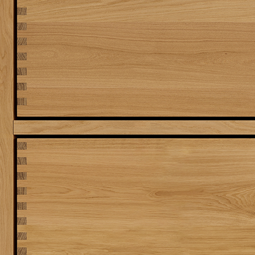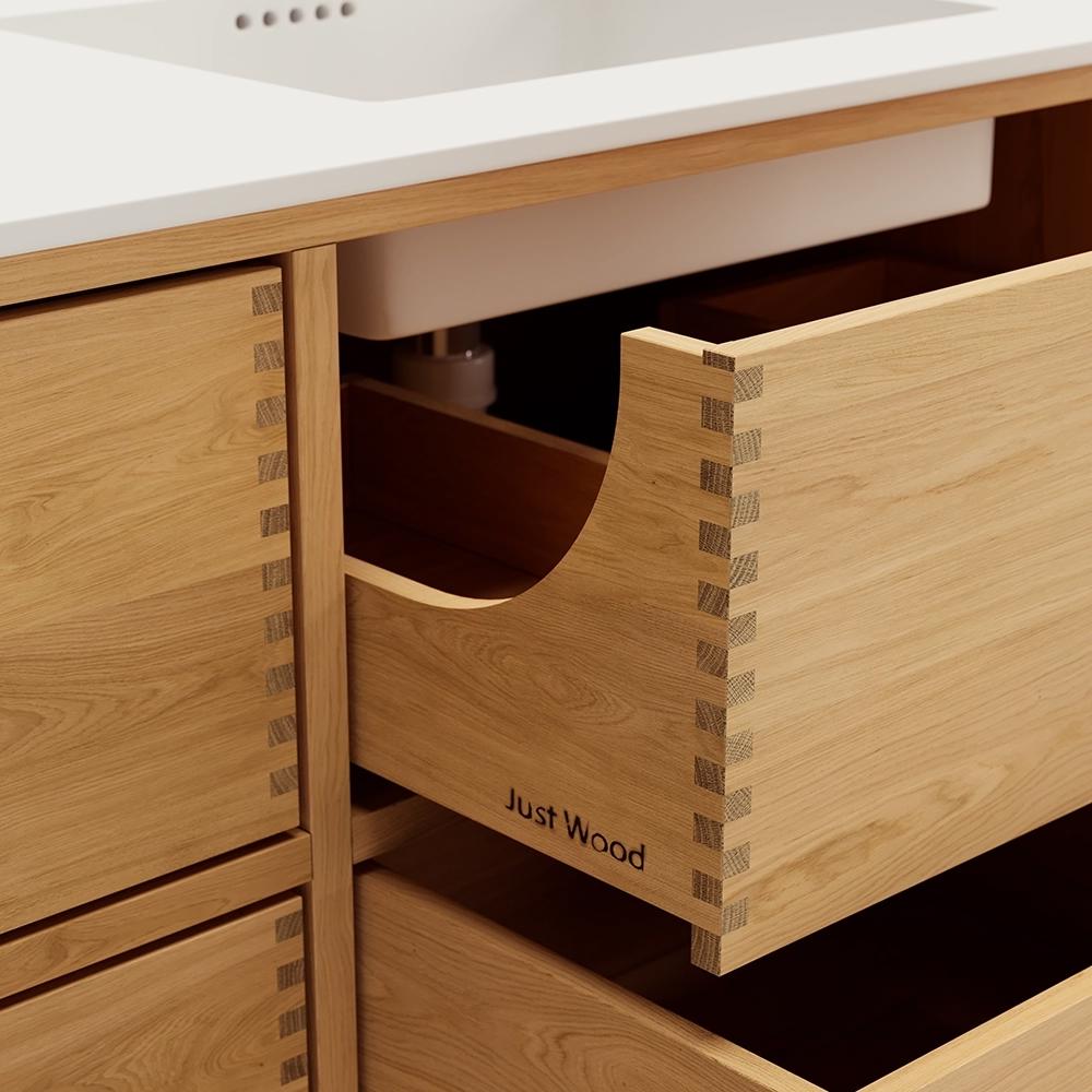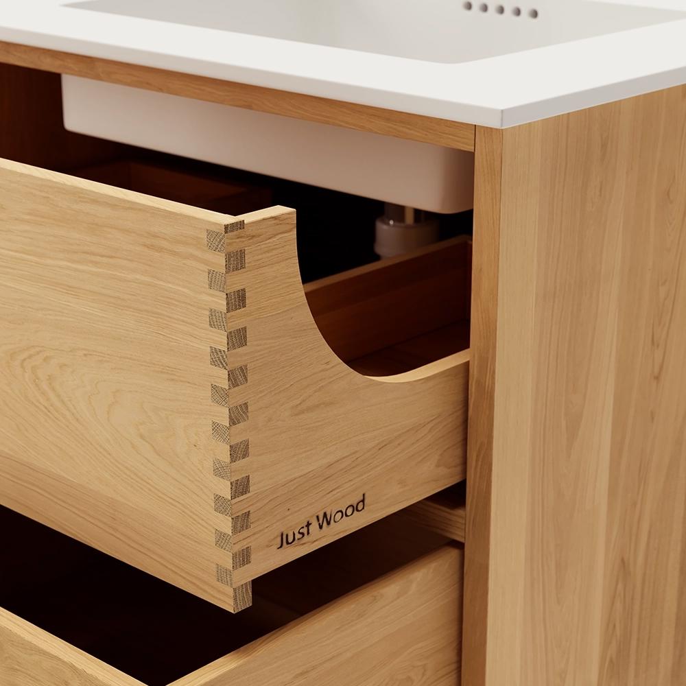 Et unikt snekkerprodukt laget av de beste materialene. Solide, oljete og fingertappende treskuffer i eik. Alle skuffer med fullt uttrekk og soft close. Sterk 8 mm. tykk understell og ekstra dype skuffer som utnytter plassen i skapet optimalt. Alt er laget for å passe perfekt sammen.