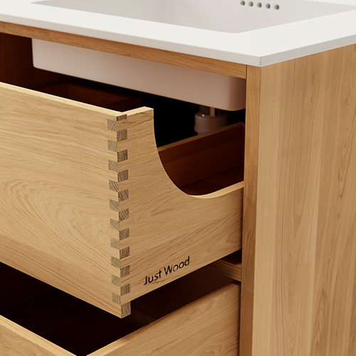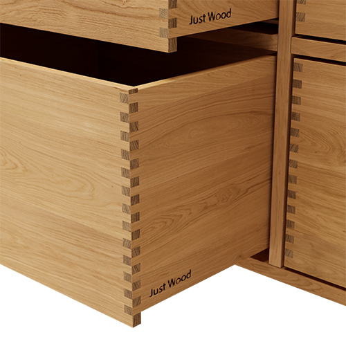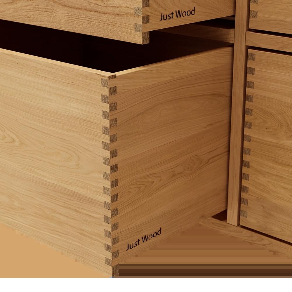 Just Wood er delvis danskproduserte elementer med massive fingertappende skuffer i eik. Møblene våre er hvitoljede fra fabrikk. Blandingsforhold er 1 del hvit og 5 deler klar olje fra Junckers.