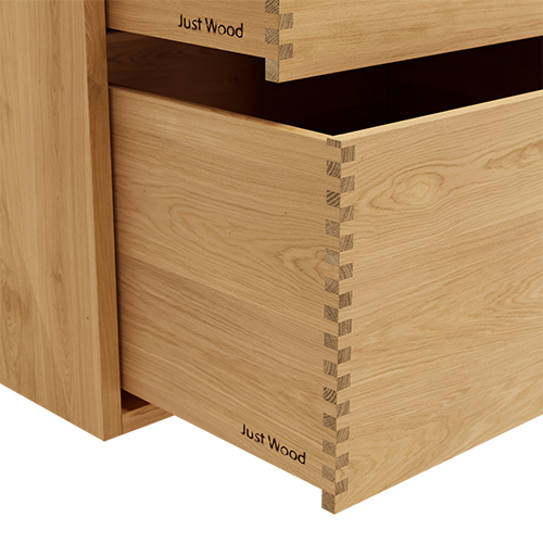 Just Wood er delvis danskproduserte elementer med massive fingertappende skuffer i eik. Møblene våre er hvitoljede fra fabrikk. Blandingsforhold er 1 del hvit og 5 deler klar olje fra Junckers.