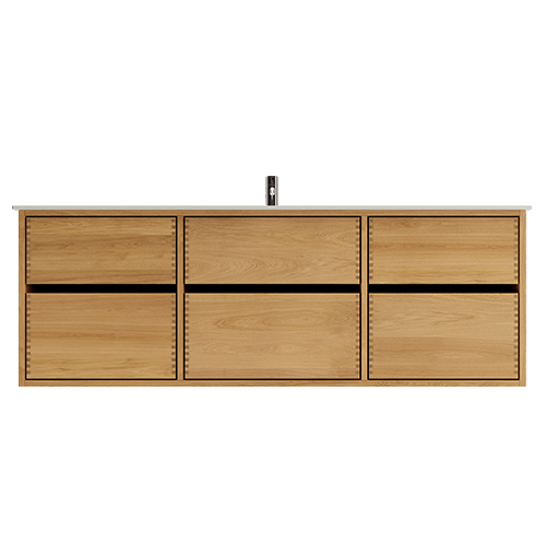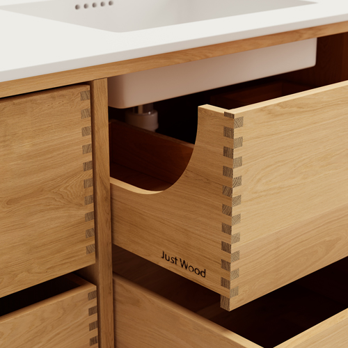Et unikt snekkerprodukt laget av de beste materialene. Solide, oljete og fingertappende treskuffer i eik. Alle skuffer med fullt uttrekk og soft close. Sterk 8 mm. tykk understell og ekstra dype skuffer som utnytter plassen i skapet optimalt. Alt er laget for å passe perfekt sammen.