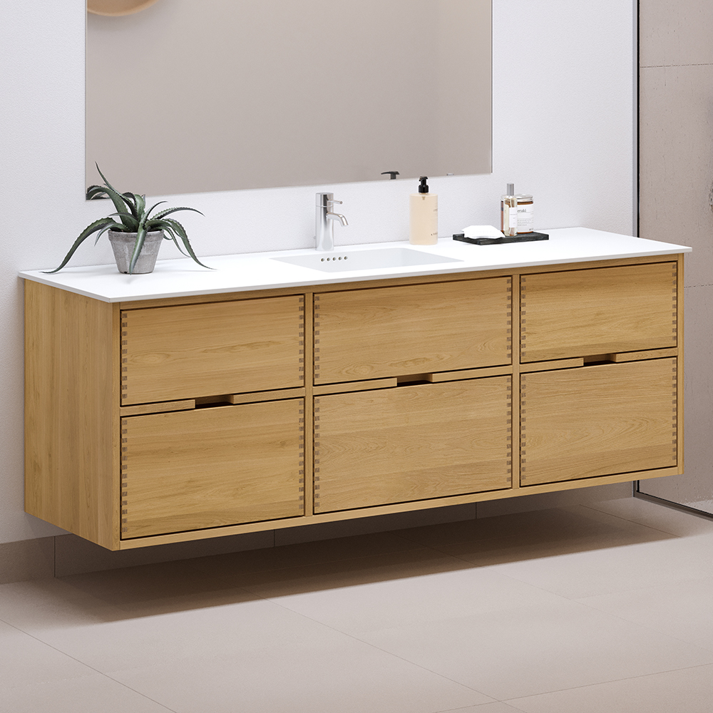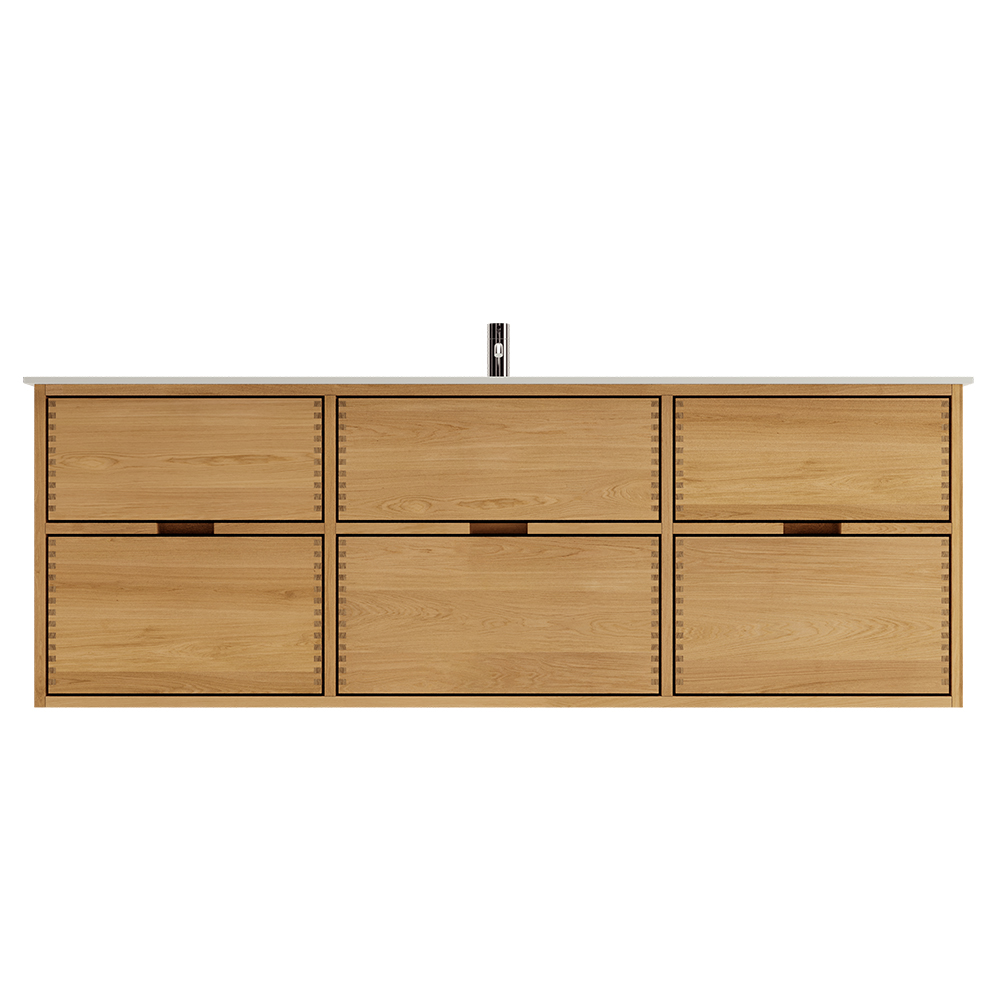 Et unikt snekkerprodukt laget av de beste materialene. Solide, oljete og fingertappende treskuffer i eik. Alle skuffer med fullt uttrekk og soft close. Sterk 8 mm. tykk understell og ekstra dype skuffer som utnytter plassen i skapet optimalt. Alt er laget for å passe perfekt sammen.