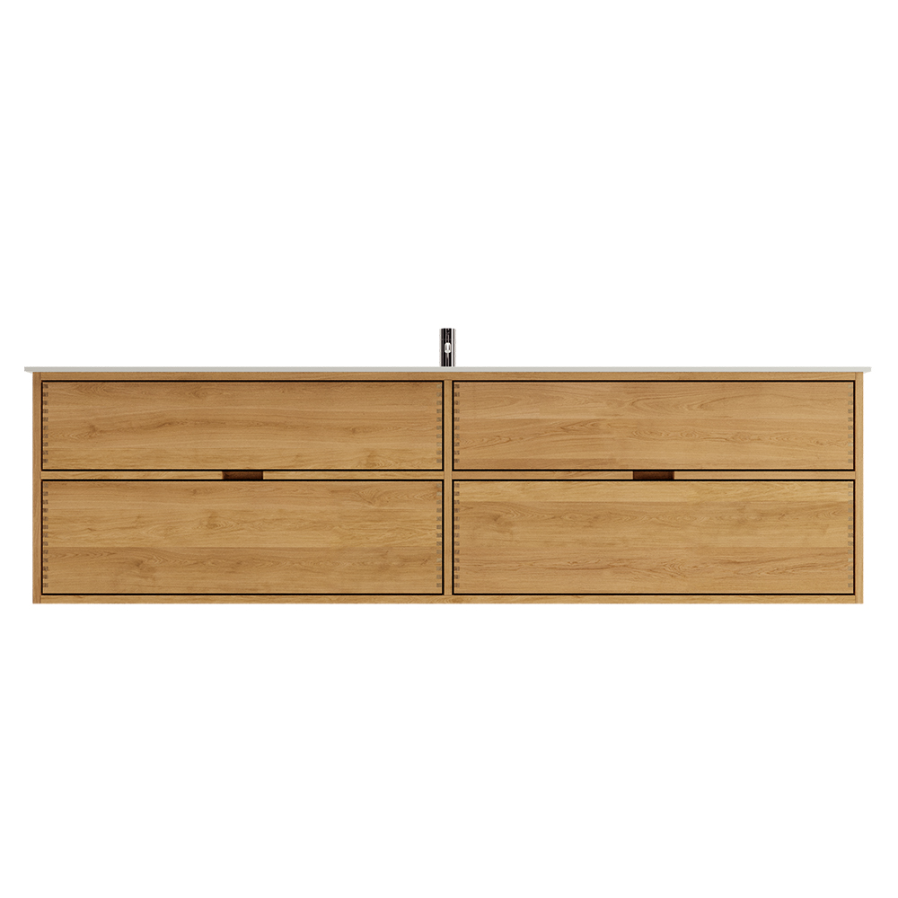 Et unikt snekkerprodukt laget av de beste materialene. Solide, oljete og fingertappende treskuffer i eik. Alle skuffer med fullt uttrekk og soft close. Sterk 8 mm. tykk understell og ekstra dype skuffer som utnytter plassen i skapet optimalt. Alt er laget for å passe perfekt sammen.