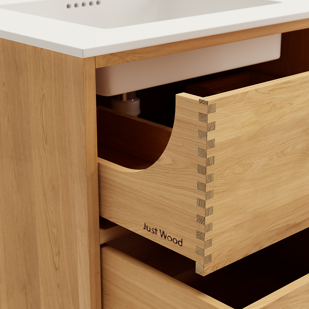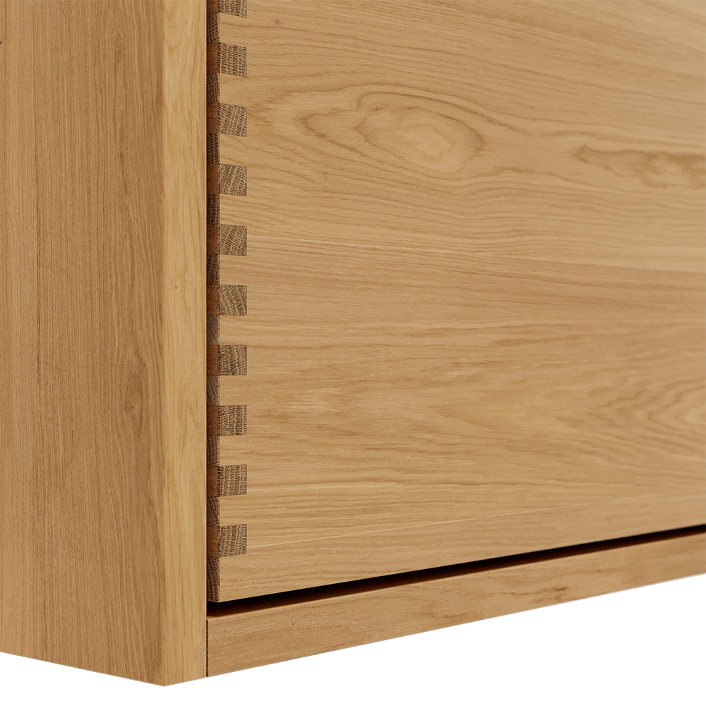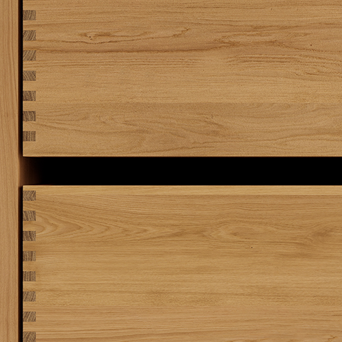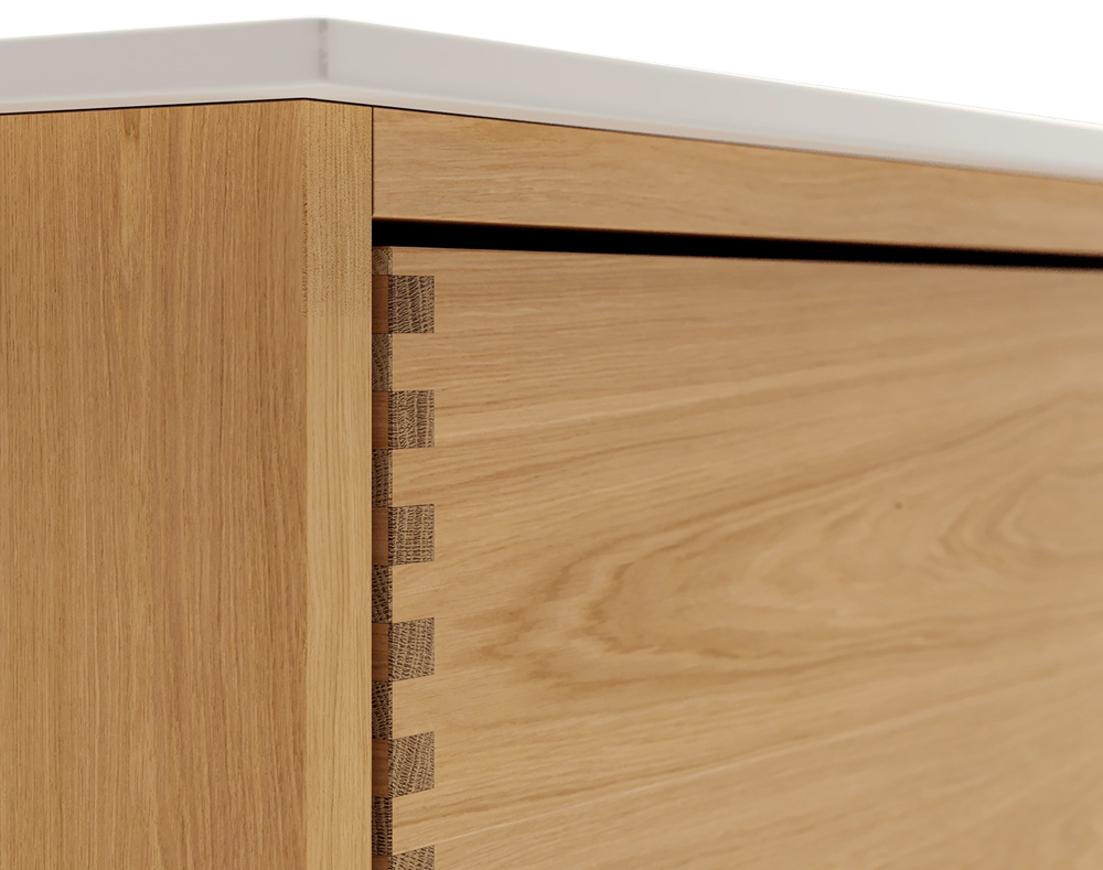 Et unikt snekkerprodukt laget av de beste materialene. Solide, oljete og fingertappende treskuffer i eik. Alle skuffer med fullt uttrekk og soft close. Sterk 8 mm. tykk understell og ekstra dype skuffer som utnytter plassen i skapet optimalt. Alt er laget for å passe perfekt sammen.