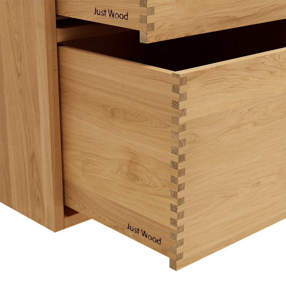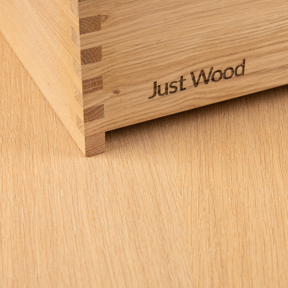 Just Wood er delvis danskproduserte elementer med massive fingertappende skuffer i eik. Møblene våre er hvitoljede fra fabrikk. Blandingsforhold er 1 del hvit og 5 deler klar olje fra Junckers.