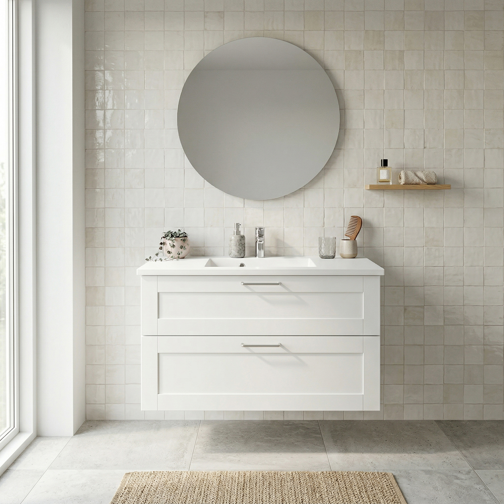 Leveres umontert og uten blandebatteri, bunnventil, speil og lys.