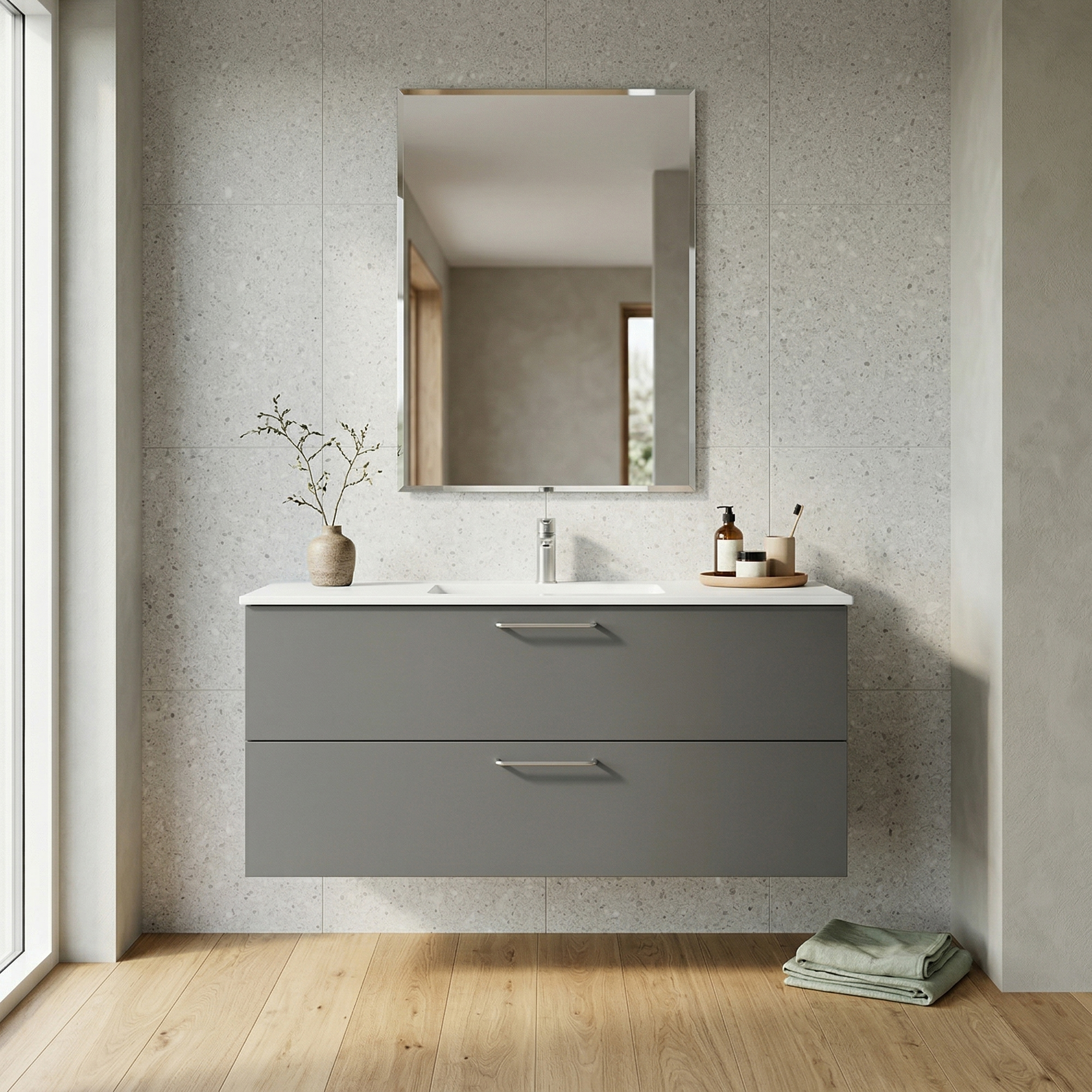 Leveres umontert og uten blandebatteri, bunnventil, speil og lys.