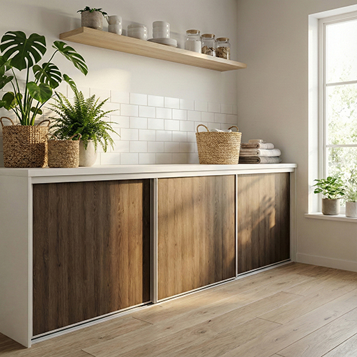 Skyvedørene har aluminum og topp- og bunnhjul. Døren går på hjulene i bunnen. På toppen av døren er det montert 4 hjul som styres av en aluminum . All vekten fra døren hviler på skinne.