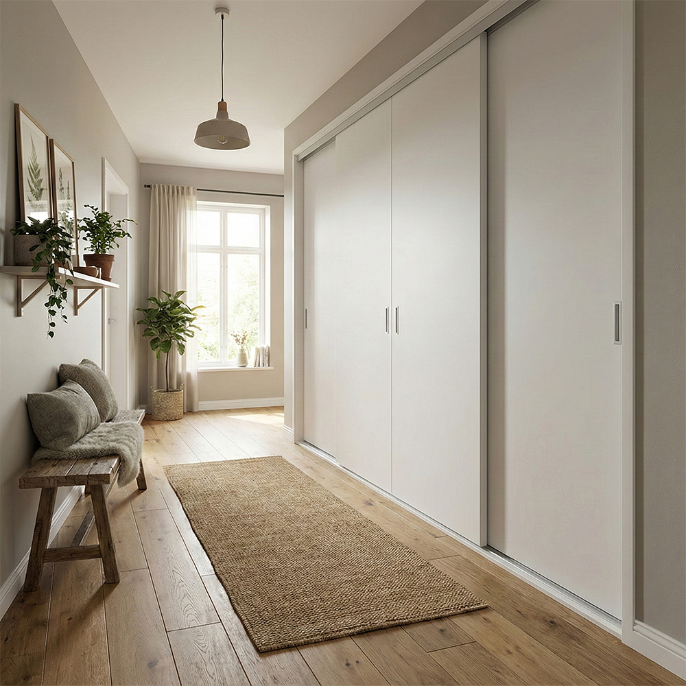 4 skyvedører fra bredde 608 - 707cm. Prisen inkluderer skinne og beslagsboks.